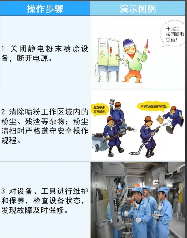 ⑤崗位風(fēng)險(xiǎn):靜電粉末噴涂崗位存在一定的安全風(fēng)險(xiǎn),如粉末泄漏、電擊等,需要操作人員嚴(yán)格遵守安全靜電粉末噴涂操作規(guī)程。
