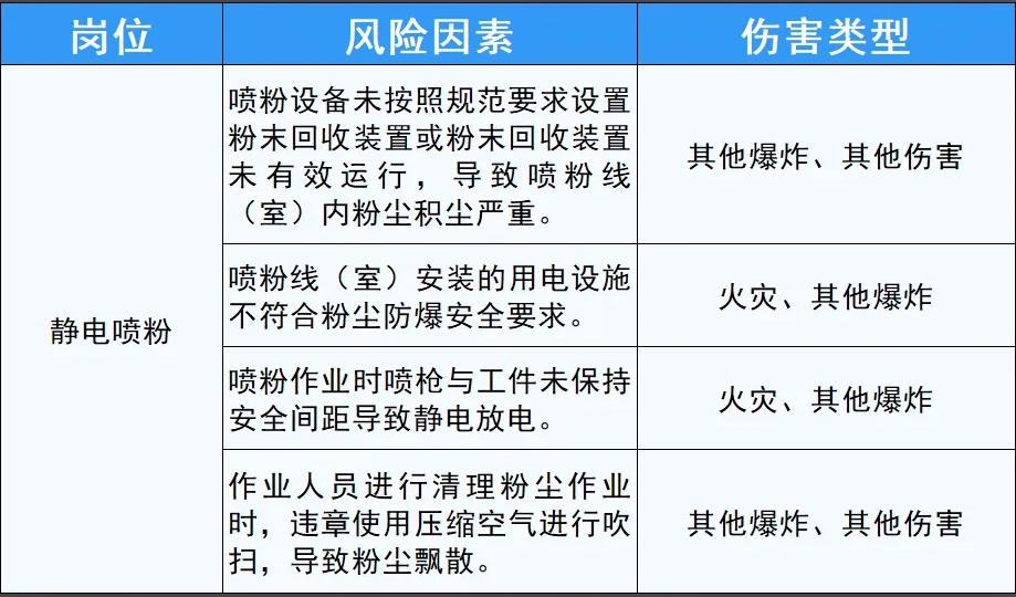 靜電粉末噴涂作業(yè)過(guò)程中可能涉及的風(fēng)險(xiǎn)包括火災(zāi)、觸電、其他爆炸(粉塵爆炸)、機(jī)械傷害、其他傷害(砸傷、塵肺)等情況。