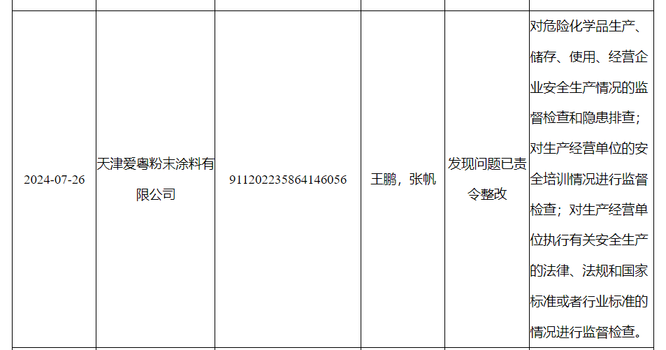根據(jù)披露,對(duì)天津愛(ài)粵粉末涂料有限公司檢查事項(xiàng)為:對(duì)危險(xiǎn)化學(xué)品生產(chǎn)、儲(chǔ)存、使用、經(jīng)營(yíng)企業(yè)安全生產(chǎn)情況的監(jiān)督檢查和隱患排查;對(duì)生產(chǎn)經(jīng)營(yíng)單位執(zhí)行有關(guān)安全生產(chǎn)的法律、法規(guī)和國(guó)家標(biāo)準(zhǔn)或者行業(yè)標(biāo)準(zhǔn)的情況進(jìn)行監(jiān)督檢查;對(duì)生產(chǎn)經(jīng)營(yíng)單位的安全培訓(xùn)情況進(jìn)行監(jiān)督檢查。