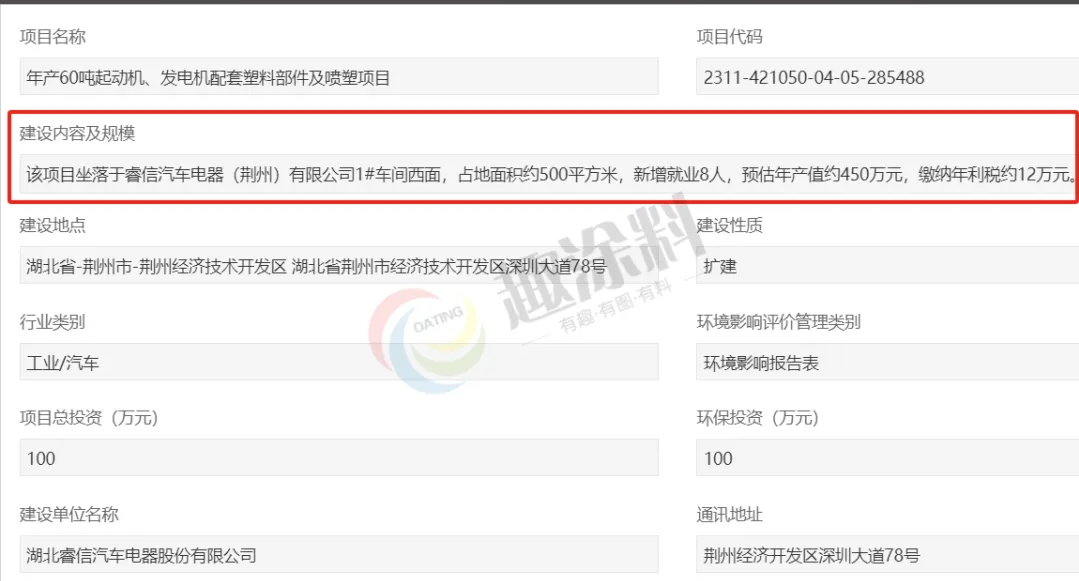 2024年6月12日,湖北睿信汽車電器股份有限公司,年產(chǎn)60噸起動(dòng)機(jī)、發(fā)電機(jī)配套塑料部件及噴塑項(xiàng)目,在荊州市生態(tài)環(huán)境局荊州經(jīng)濟(jì)技術(shù)開發(fā)區(qū)分局,進(jìn)行項(xiàng)目環(huán)評(píng)審批。