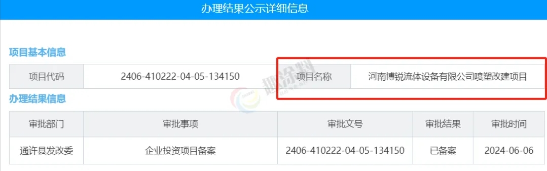 2024年6月6日,河南博銳流體設(shè)備有限公司,噴塑改建項(xiàng)目,在通許縣發(fā)改委,進(jìn)行企業(yè)投資項(xiàng)目備案。