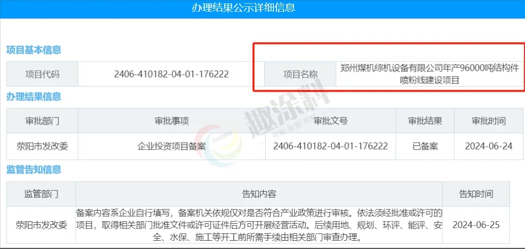 2024年6月24日,鄭州煤機(jī)綜機(jī)設(shè)備有限公司,年產(chǎn)96000噸結(jié)構(gòu)件噴粉線建設(shè)項(xiàng)目,在滎陽(yáng)市發(fā)改委,進(jìn)行企業(yè)投資項(xiàng)目備案。