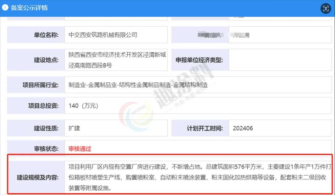 2024年5月28日,中交西安筑路機(jī)械有限公司,年產(chǎn)1萬(wàn)件打包箱板材噴塑生產(chǎn)線建設(shè)項(xiàng)目,進(jìn)行企業(yè)投資項(xiàng)目備案。