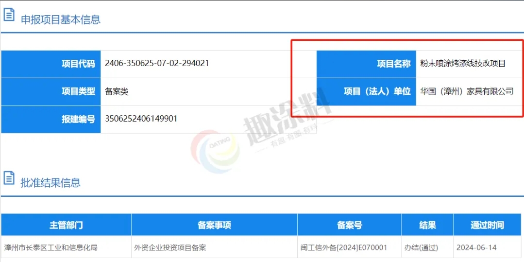 2024年6月14日,華國(guó)(漳州)家具有限公司,粉末噴涂烤漆線技改項(xiàng)目,在漳州市長(zhǎng)泰區(qū)工業(yè)和信息化局,進(jìn)行外資企業(yè)投資項(xiàng)目備案。