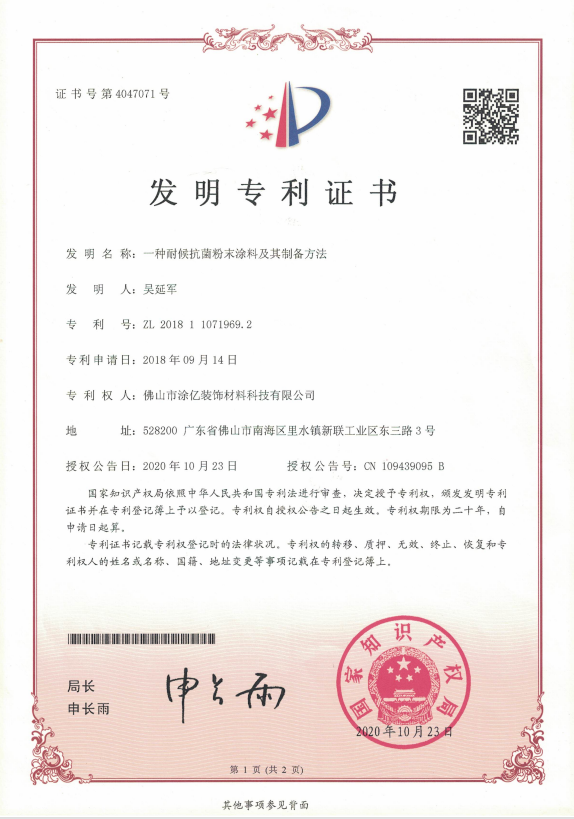 佛山涂?jī)|《一種耐候抗菌粉末涂料及其制備辦法 》榮獲殊榮