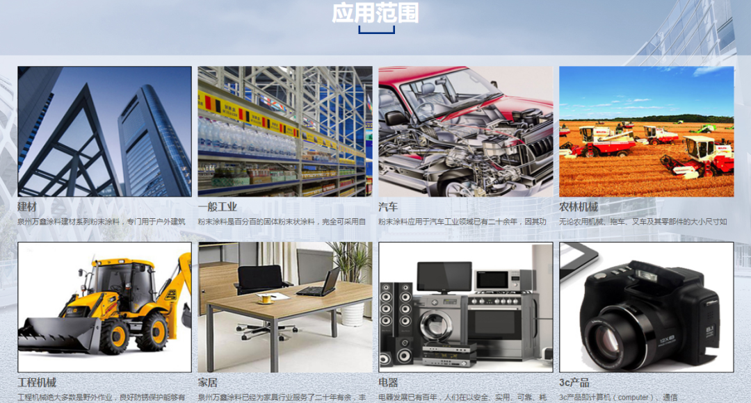 萬順粉末涂料成立于1992年,擁有悠久的歷史和豐富的經(jīng)驗,其環(huán)氧型、聚酯型及環(huán)氧聚酯混合型粉末涂料暢銷全國。30年來,萬順粉末被廣泛的運用于各種行業(yè):建筑、計算機、白色家電、汽車、電子電氣、家具和通用金屬等。
