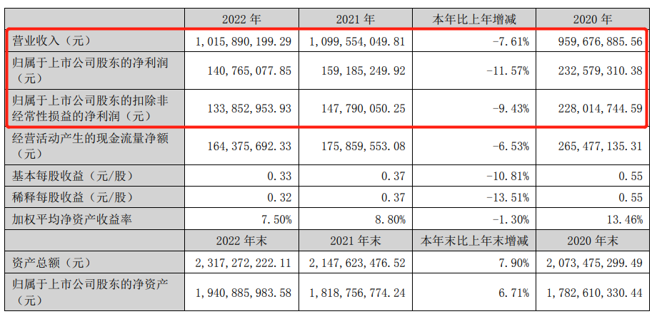 年報中指出,2022年全年,高盟新材實現(xiàn)營業(yè)收入10.16億元,與上年相比減少8366.39萬元,降幅為7.61%;實現(xiàn)營業(yè)利潤1.61億元,與上年相比減少1880.74萬元,降幅為10.47%;實現(xiàn)歸屬上市公司股東的凈利潤1.41億元,與上年相比減少1842.02萬元,降幅為11.57%。
