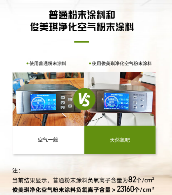 “負(fù)氧離子粉末系列產(chǎn)品的推出,為粉末涂料應(yīng)用領(lǐng)域開(kāi)辟了一條健康的新思路。俊美琪凈化空氣粉末涂料負(fù)氧離子含量>23160個(gè)/cm2,針對(duì)整體空間的空氣凈化,持續(xù)釋放負(fù)氧離子,降解甲醛、PM2.5,分解苯、氨等空氣有害物質(zhì),抑制常見(jiàn)細(xì)菌滋生、消解難聞氣體,保證長(zhǎng)期改善室內(nèi)空間空氣質(zhì)量,保障空間內(nèi)人體健康和空氣污染的凈化效果。”俊美琪負(fù)責(zé)人向趣涂料(趣涂網(wǎng))介紹道。