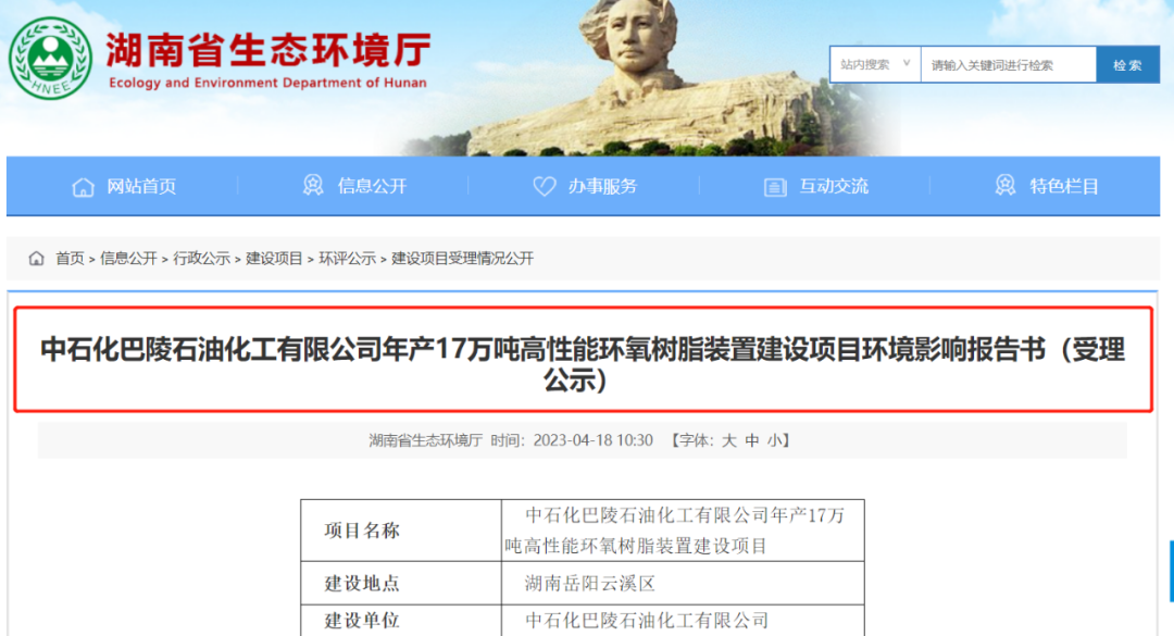2023年4月18日,湖南省生態(tài)環(huán)境廳受理中石化巴陵石油化工有限公司年產(chǎn)17萬噸高性能環(huán)氧樹脂裝置建設(shè)項目環(huán)境影響報告書。
