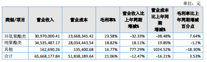 其中環(huán)氧聚酯類實(shí)現(xiàn)營業(yè)收入3097萬元,同比下滑32.33%;純聚酯類實(shí)現(xiàn)營業(yè)收入3453.55萬元,同比下滑1.2%。