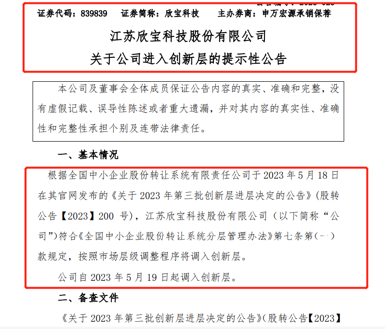 近日,全國股轉(zhuǎn)系統(tǒng)2023年第三批創(chuàng)新層企業(yè)正式名單公布,新三板掛牌公司江蘇欣寶科技股份有限公司(下稱“欣寶科技”)榜上有名。欣寶科技自2023年5月19日起正式調(diào)入創(chuàng)新層。