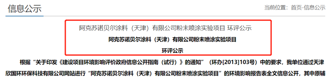 近日,阿克蘇諾貝爾涂料(天津)有限公司粉末噴涂實驗項目環(huán)評對外公示。