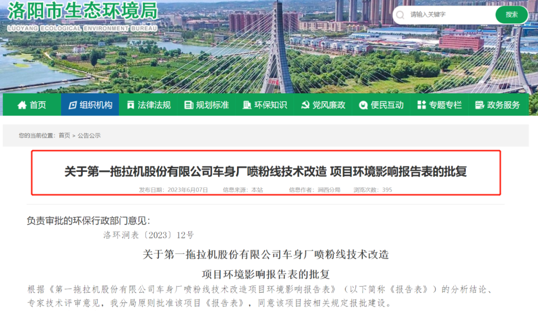 2023年6月07日,洛陽(yáng)市生態(tài)環(huán)境局對(duì)外發(fā)布《關(guān)于第一拖拉機(jī)股份有限公司車(chē)身廠噴粉線技術(shù)改造 項(xiàng)目環(huán)境影響報(bào)告表的批復(fù)》。