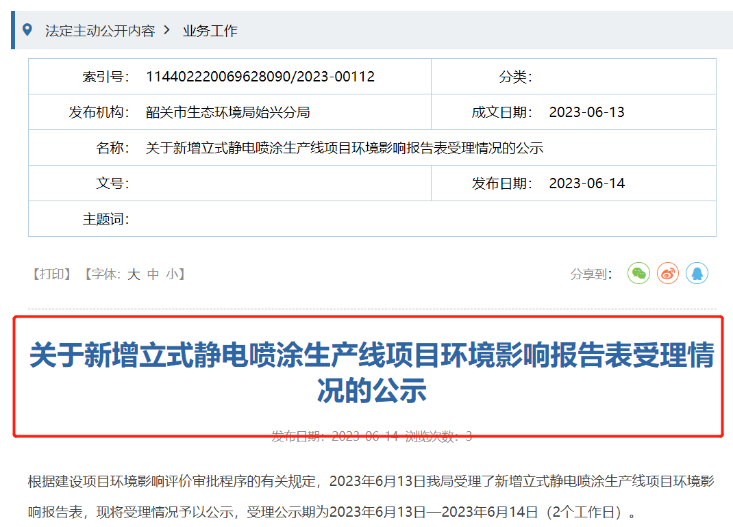 近日,韶關(guān)市生態(tài)環(huán)境局始興分局對外公示《關(guān)于新增立式靜電噴涂生產(chǎn)線項目環(huán)境影響報告表受理情況》。該項目建設(shè)單位為廣東鳳閣鋁業(yè)有限公司(下稱“鳳閣鋁業(yè)”),建設(shè)地點位于始興產(chǎn)業(yè)轉(zhuǎn)移工業(yè)園鳳閣鋁業(yè)內(nèi)。