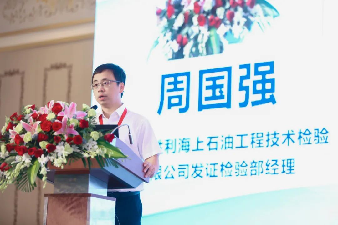 中石化勝利海上石油工程技術(shù)檢驗(yàn)有限公司發(fā)證檢驗(yàn)部經(jīng)理周國(guó)強(qiáng)作《勝利鋼質(zhì)采油平臺(tái)防腐蝕實(shí)踐與提升》報(bào)告。