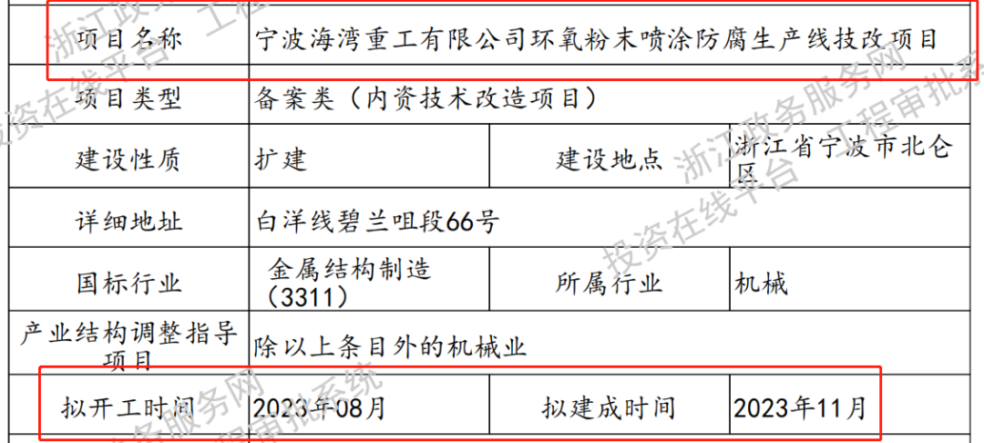 8月,寧波海灣重工有限公司環(huán)氧粉末噴涂防腐生產(chǎn)線技改項目擬開工。趣涂料(趣涂網(wǎng))了解到,該項目位于浙江省寧波市北侖區(qū)白洋線碧蘭咀段66號,總投資791萬元,企業(yè)新增一條環(huán)氧粉末噴涂線,改建一條環(huán)氧粉末噴涂線,新增一條拋丸線,兩條噴涂線合計消耗135噸環(huán)氧粉末。