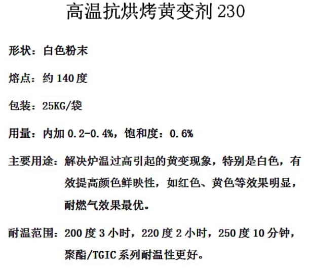 燃?xì)鉅t抗黃變劑可有效避免和減輕粉末涂料在燃?xì)鉅t中烘烤固化時(shí),涂層中的組份被高溫下的少量氧化性氣體氧化而出現(xiàn)黃變現(xiàn)象,導(dǎo)致涂層的色差大,加入燃?xì)鉅t抗黃變劑230可以避免和減輕該現(xiàn)象。