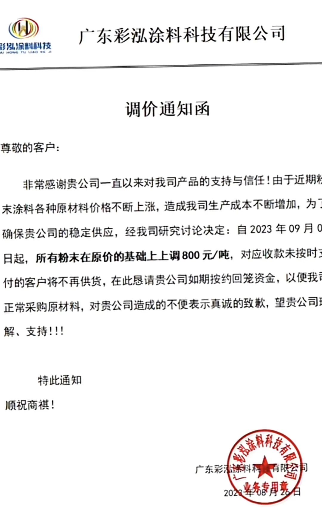 近日,廣東彩泓涂料科技有限公司對外發(fā)布漲價函稱,由于近期粉末涂料各種原材料價格不斷上漲,造成我司生產成本不斷增加,為確保貴公司的穩(wěn)定供應,經我司研究討論決定:所有粉末在原價的基礎上上調800元/噸,對應收款未按時付的客戶將不再供貨,在此懇請貴公司如期按約回籠資金,以便我正常采購原材料。