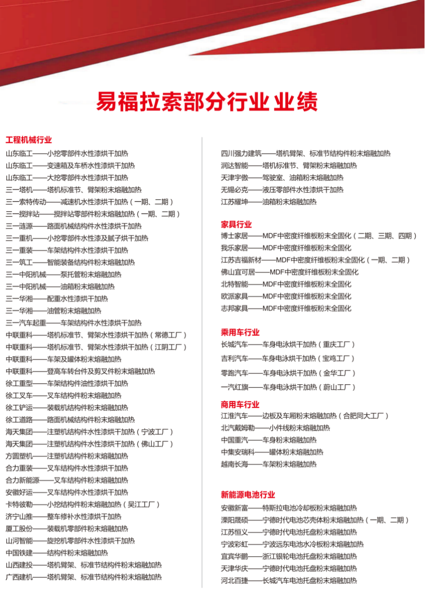 特斯拉創(chuàng)始人埃隆·馬斯克說:創(chuàng)新是發(fā)展的第一動(dòng)力,技術(shù)是創(chuàng)新的重要引擎。作為成立于2019年專注于紅外加熱和UV光固化應(yīng)用領(lǐng)域的易福拉索更是如此。易福拉索從成立之初,就知道技術(shù)不是囿于實(shí)驗(yàn)室的新科技、新技術(shù)、新材料,而是從理論落地到產(chǎn)業(yè),進(jìn)而改變社會(huì)和家庭生活方式的創(chuàng)新科技。因此,其選擇了站在巨人的肩膀之上,為客戶提供可靠的產(chǎn)品。經(jīng)過其不斷的發(fā)展,其產(chǎn)品成功應(yīng)用于:溶劑型油漆、水性漆的烘干(全烘干處理),粉末涂料熔融、粉末涂料固化(全固化處理),電纜絕緣漆干燥、玻璃涂料烘干(裝飾、鏡面加工)、產(chǎn)品處理的再預(yù)熱、紡織烘干加熱、表面處理后的干燥(如噴砂、清潔)、油墨干燥、橡膠硬化加熱、塑料成型加工、木材工業(yè)(中密度纖維板和高密度纖維板烤漆及粉末全固化)、食品烘干等工業(yè)生產(chǎn)環(huán)節(jié)。