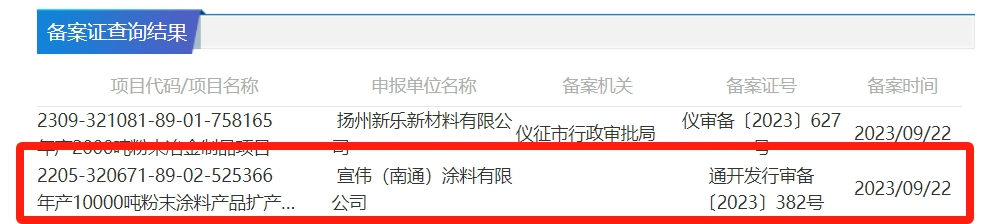 此后,宣偉繼續(xù)加大在中國(guó)的投資,總投資約3億元在江蘇南通新建年產(chǎn)3萬(wàn)噸高端水性涂料項(xiàng)目;2022年,宣偉(南通)年產(chǎn)6000噸粉末涂料擴(kuò)建項(xiàng)目,在南通經(jīng)濟(jì)技術(shù)開發(fā)區(qū)行政審批局,進(jìn)行企業(yè)投資技術(shù)改造項(xiàng)目備案的申報(bào)。