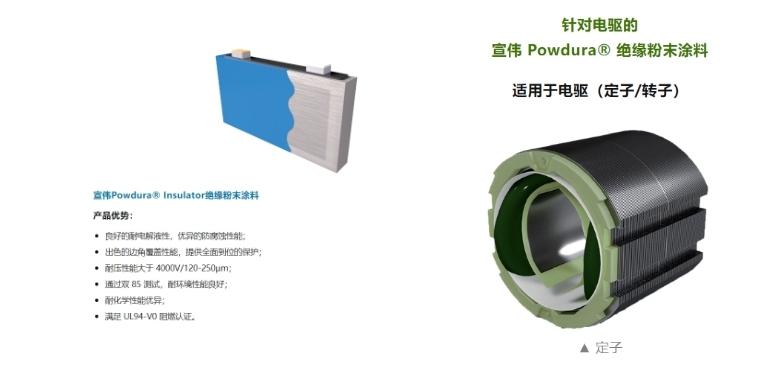 另外,針對(duì)新能源汽車動(dòng)力電池及儲(chǔ)能系統(tǒng),宣偉推出Powdura? Insulator絕緣粉末涂料解決方案,能夠滿足客戶對(duì)膜厚以及絕緣強(qiáng)度的個(gè)性化需求,優(yōu)異的耐腐蝕性能、以及出色的邊角覆蓋性能,為動(dòng)力電池提供全面到位的保護(hù)。針對(duì)電池電芯以及與電解液接觸的工件,宣偉推出Powdura?絕緣粉末涂料及UV光固化涂料解決方案。