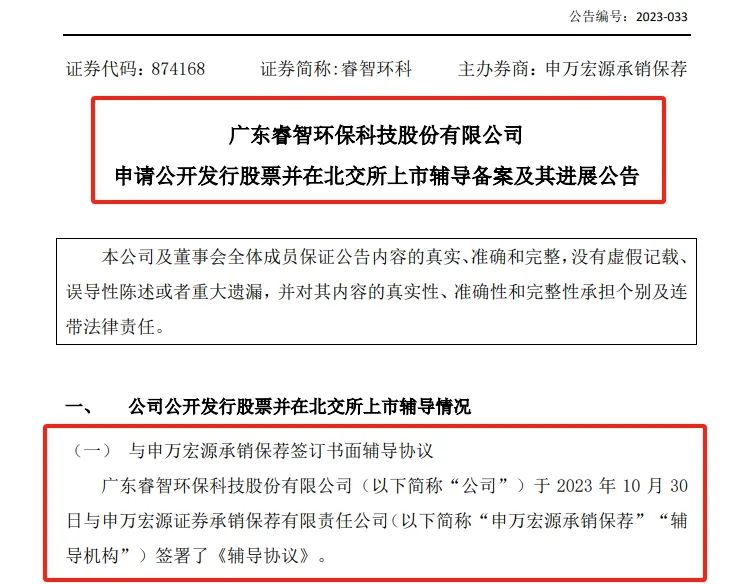 公告中指出,睿智環(huán)科于10月30日與申萬宏源證券簽署了《輔導(dǎo)協(xié)議》。同日,公司向廣東證監(jiān)局提交了向不特定合格投資者公開發(fā)行股票并在北交所上市輔導(dǎo)備案材料,輔導(dǎo)機(jī)構(gòu)為申萬宏源證券。