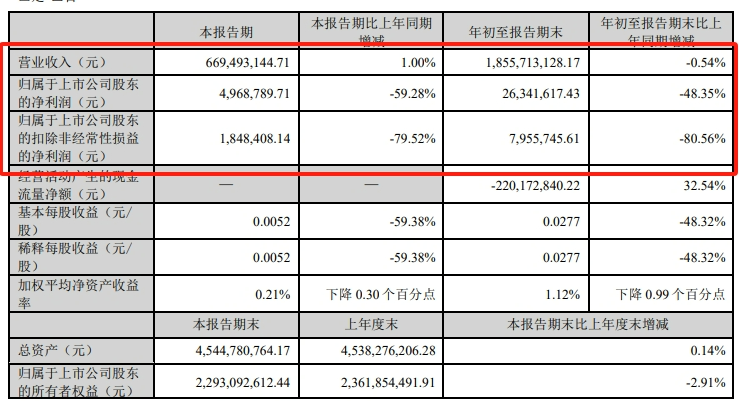 報告顯示,神劍股份2023年前三季度實現(xiàn)營業(yè)收入18.56億元,同比下滑0.54%;實現(xiàn)凈利潤2634.16萬元,同比下滑48.35%;實現(xiàn)扣非后凈利潤795.57萬元,同比下滑80.56%%。其中,第三季度實現(xiàn)營業(yè)收入6.69億元,同比增長1%;實現(xiàn)凈利潤496.88萬元,同比下滑59.28%;實現(xiàn)扣非后凈利潤184.84萬元,同比下滑79.52%。
