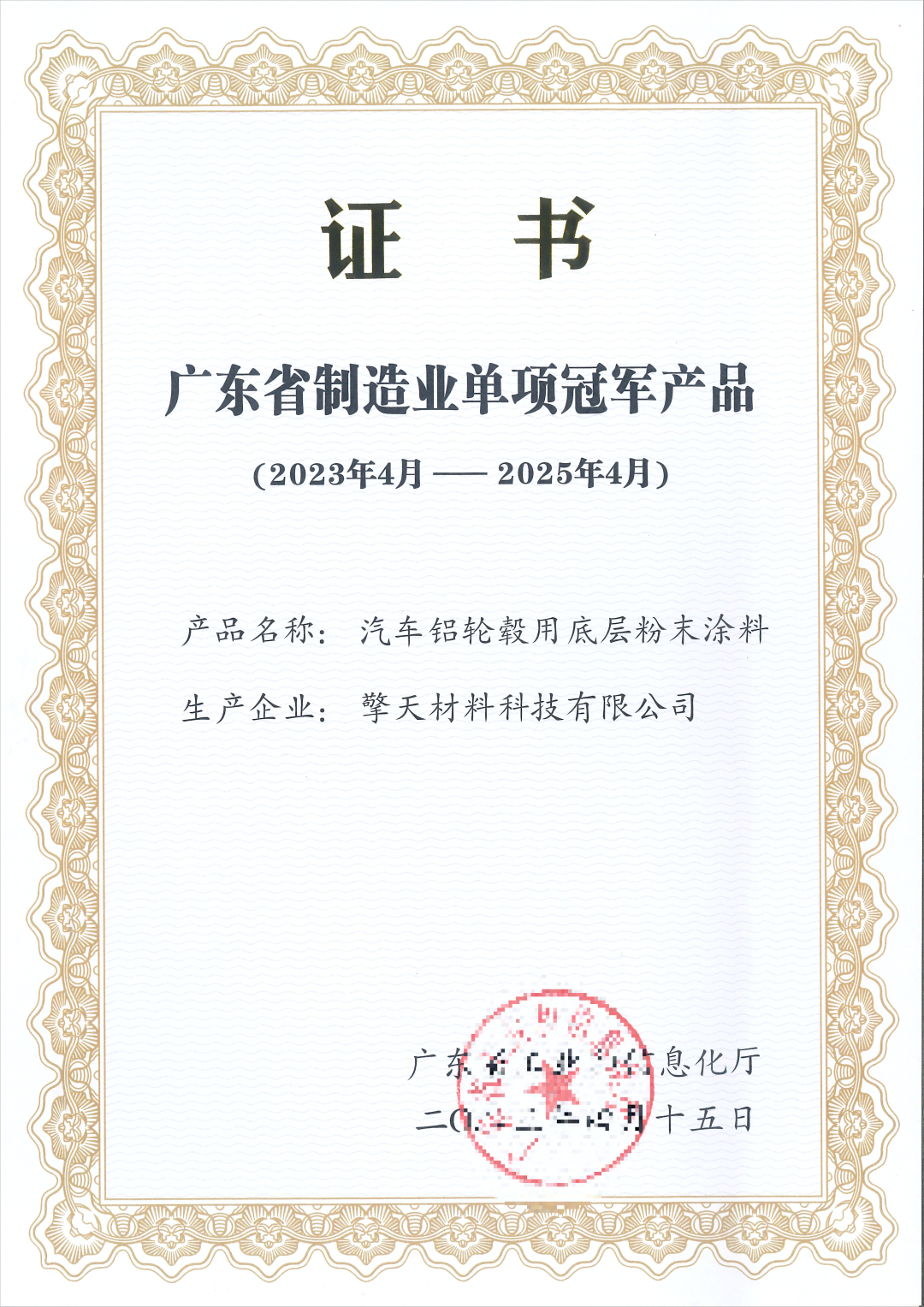 產(chǎn)品好,市場毫不吝惜的給予企業(yè)積極反饋。就比如最近,擎天材料就收到來自廣東省工業(yè)和信息化廳的榮譽證書,公司的“汽車鋁輪轂用底層粉末涂料”憑借領(lǐng)先的技術(shù)水平、優(yōu)異的產(chǎn)品質(zhì)量、較高的市場占有率以及良好的應(yīng)用口碑等,斬獲“制造業(yè)單項冠軍產(chǎn)品”榮譽稱號。