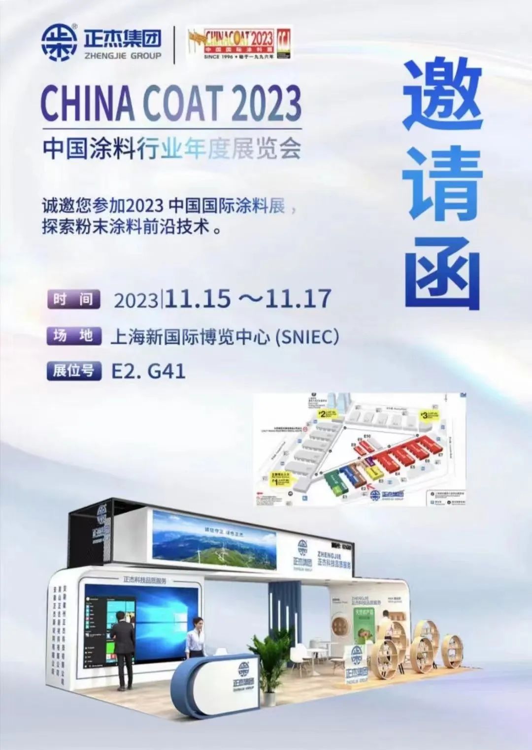 為了能夠讓客戶、伙伴切身感受到正杰集團(tuán)的實(shí)力與溫暖,其將于2023年11月15日至17日在上海新國(guó)際博覽中心,與您相約中國(guó)國(guó)際涂料展【中國(guó)國(guó)際表面處理展】展區(qū)E2.G41。