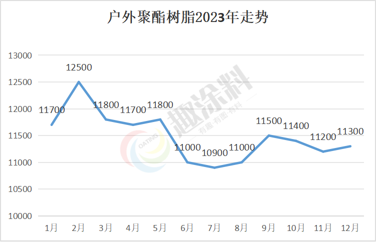 2023年,戶內(nèi)聚酯最高點(diǎn)在11100元/噸,最低點(diǎn)在10200元/噸;戶外聚酯最高點(diǎn)在12500元/噸,最低點(diǎn)在10900元/噸。二者全年整體均呈現(xiàn)緩慢下滑趨勢。