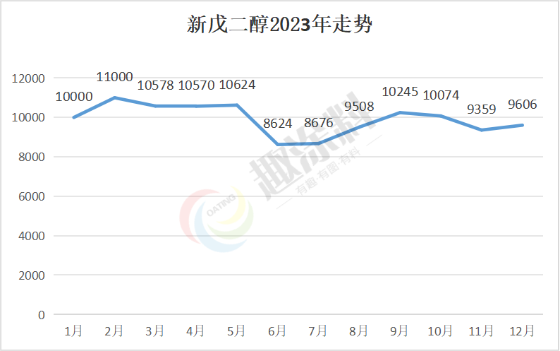 和2022年高低點(diǎn)相差8950元/噸的劇烈波動相比,2023年新戊二醇價格走勢平穩(wěn)的出奇,屬于近三年的低位運(yùn)行。除了年初因工廠停車、備貨影響價格上漲外,全年受制于下游需求有限,大部分時間新戊二醇價格都在8600~11000元左右區(qū)間整理。