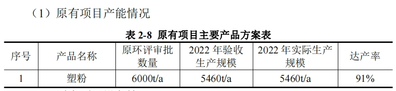 企業(yè)原有項目位于海寧市鹽官鎮(zhèn)建設東路11號,租賃的海寧景上照明科技有限公司廠,主要從事塑粉新材料的研發(fā)、制造、加工。目前企業(yè)仍在正常生產中,待新項目建設完成后原有項目將停產實施整體搬遷,廠房將由原房東收回。原有項目2022年實際生產規(guī)模5460噸/年,達產率91%。