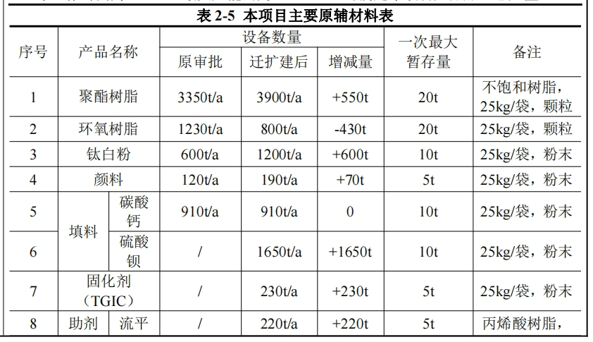 根據(jù)披露,本項目主要原輔材料表聚酯樹脂3900t/a、環(huán)氧樹脂800t/a、鈦白粉1200t/a、顏料190t/a、碳酸鈣填料910t/a、硫酸鋇填料1650t/a、固化劑(TGIC)230t/a、流平劑助劑220t/a、納米鋇助劑125t/a、蠟粉助劑20t/a等。