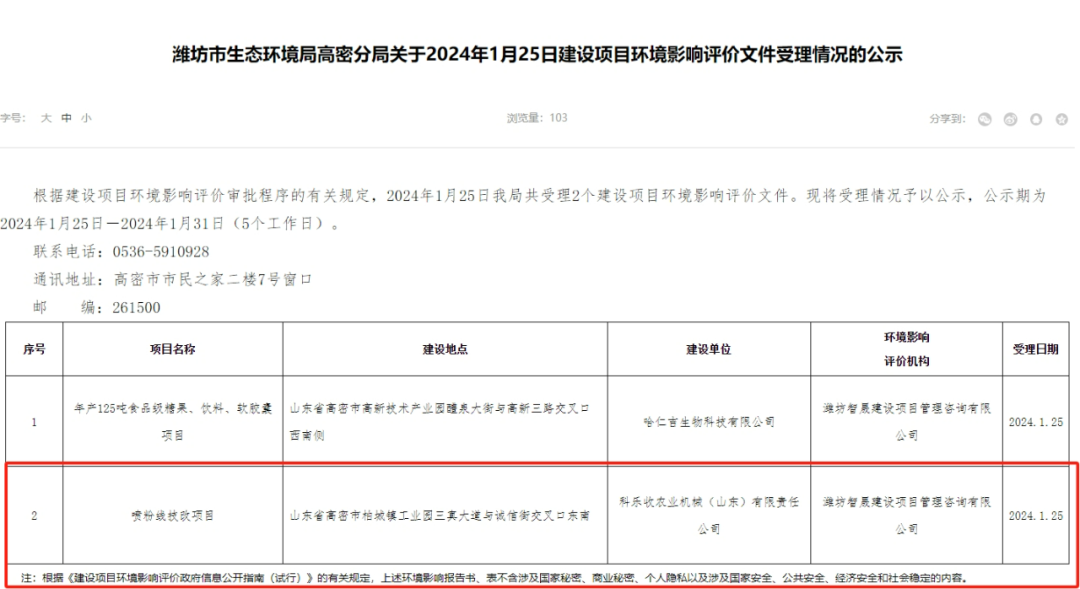 根據(jù)濰坊市生態(tài)環(huán)境局高密分局近日發(fā)布的《關(guān)于2024年1月25日建設(shè)項(xiàng)目環(huán)境影響評(píng)價(jià)文件受理情況的公示》顯示,科樂收農(nóng)業(yè)機(jī)械(山東)有限責(zé)任公司,噴粉線技改項(xiàng)目已進(jìn)入環(huán)評(píng)階段。