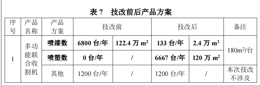 根據(jù)披露,為進(jìn)一步降低企業(yè)成本,推進(jìn)污染物減排成效,依據(jù)《低揮發(fā)性原輔材料替代企業(yè)豁免揮發(fā)性有機(jī)物末端治理實(shí)施細(xì)則(試行)》企業(yè)開展低揮發(fā)性原輔材料替代工作。公司擬投資1880萬元,針對(duì)“年產(chǎn)八千臺(tái)多功能聯(lián)合收割機(jī)技改擴(kuò)建項(xiàng)目”進(jìn)行技術(shù)改造,將98%的噴漆產(chǎn)能改為噴塑。新購置安裝自動(dòng)噴粉房、烘干室、打磨室等設(shè)備,形成“科樂收農(nóng)業(yè)機(jī)械(山東)有限責(zé)任公司噴粉線技改項(xiàng)目”。