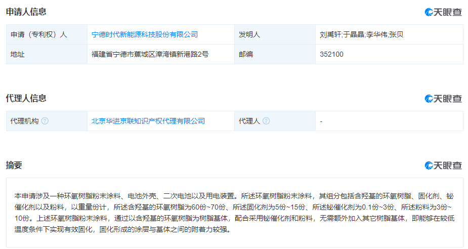 根據(jù)天眼查數(shù)據(jù)顯示,寧德時(shí)代(300750)新獲得一項(xiàng)發(fā)明專利授權(quán),專利名為“環(huán)氧樹(shù)脂粉末涂料、電池外殼、二次電池以及用電裝置”,專利申請(qǐng)?zhí)枮镃N202311052305.2,授權(quán)日為2024年2月13日。