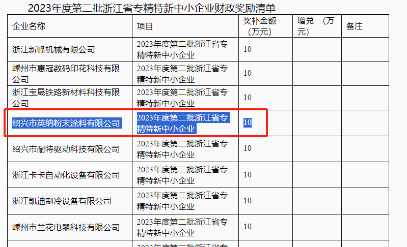 趣涂料(趣涂網(wǎng))注意到,紹興市英納粉末涂料有限公司(下稱“英納粉末”)此前被認定為2023年浙江省專精特新中小企業(yè),因此也在此次財政獎勵清單中,有望獲得獎補金額10萬元。