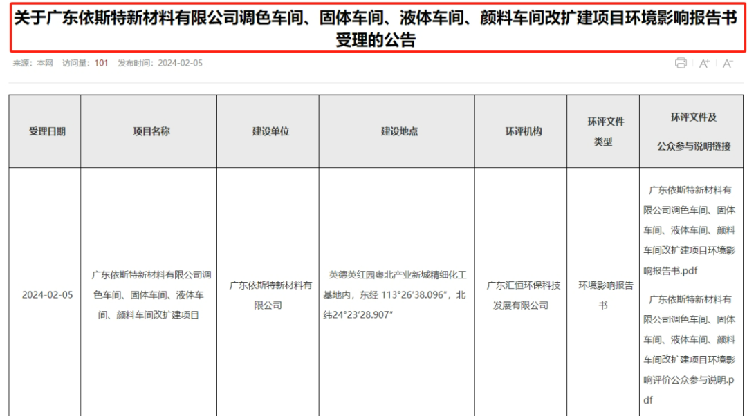 近日,清遠市生態(tài)環(huán)境局對外發(fā)布《關(guān)于廣東依斯特新材料有限公司調(diào)色車間、固體車間、液體車間、顏料車間改擴建項目環(huán)境影響報告書受理的公告》。