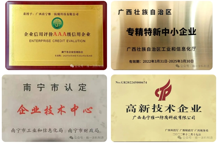 現(xiàn)今,維一防腐不僅擁有自主研發(fā)的發(fā)明專(zhuān)利、外觀設(shè)計(jì)專(zhuān)利,還獲評(píng)“高新技術(shù)企業(yè)”、南寧企業(yè)技術(shù)中心、專(zhuān)精特新中小企業(yè)、瞪羚企業(yè)等多項(xiàng)殊榮。