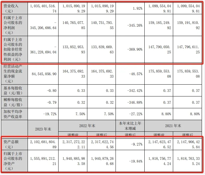 報告中指出,高盟新材2023年實現(xiàn)營業(yè)收入10.35億元,同比增長1.92%;實現(xiàn)凈利潤-3.45億元,同比下降345.26%;實現(xiàn)扣非后凈利潤-3.61億元,同比下滑369.9%。截止2023年末,公司資產(chǎn)總額為21.03億元,同比下滑9.27%;公司凈資產(chǎn)為15.56億元,同比下滑19.84%。