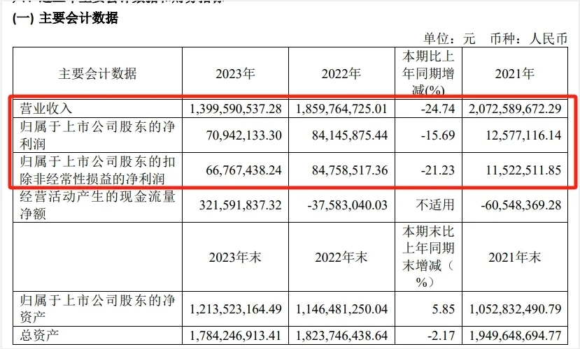 年報(bào)中指出,2023年上緯新材實(shí)現(xiàn)營(yíng)業(yè)收入為14億元,較上年同期減少24.74%,實(shí)現(xiàn)凈利潤(rùn)7094.21萬(wàn)元,較上期減少15.69%,實(shí)現(xiàn)扣非后凈利潤(rùn)6676.74萬(wàn)元,同比減少21.23%,基本每股收益較上期減少14.29%。