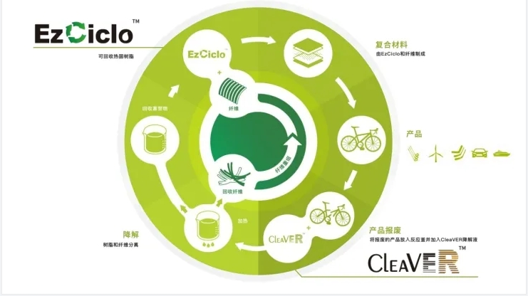 上緯全新研發(fā)的EzCiclo可回收熱固環(huán)氧樹(shù)脂,可實(shí)現(xiàn)在不改變環(huán)境條件下正常應(yīng)用于葉片的殼體、主梁、腹板等部件。由EzCiclo制成的風(fēng)電葉片復(fù)合材料部件,到了使用年限后可回收降解,經(jīng)過(guò)CleaVER技術(shù)將固體廢棄物變?yōu)榛厥绽w維及寡聚物,回收纖維可重整后再利用,再次制成玻璃纖維及碳纖維復(fù)合材料,整個(gè)降解回收過(guò)程簡(jiǎn)易、低碳。