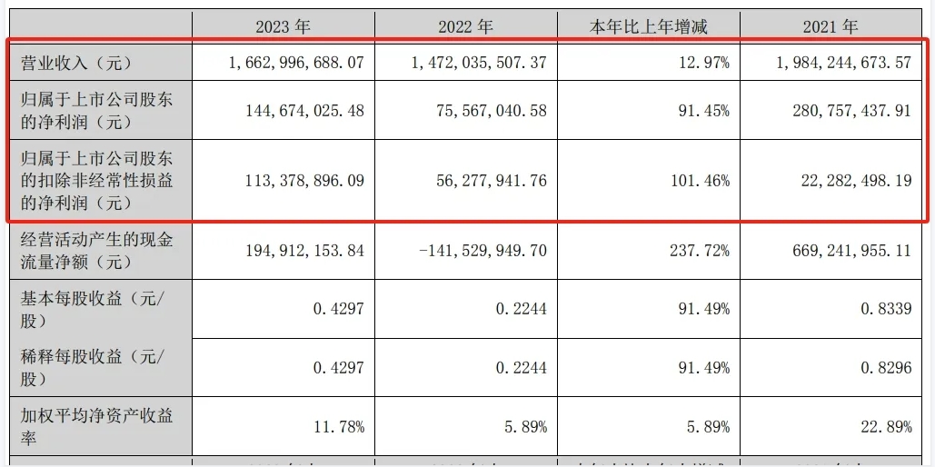 2023年,快意電梯實現(xiàn)營業(yè)收入16.63億元,同比增長12.97%;實現(xiàn)凈利潤1.45億元,同比增長91.45%;實現(xiàn)扣非后凈利潤1.13億元,同比增長101.46%。