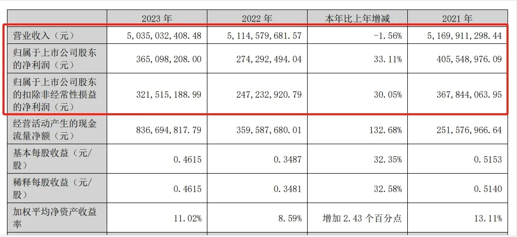 2023年,康力電梯實現(xiàn)營業(yè)收入達50.35億元,較上年同期下降1.56%;實現(xiàn)利潤總額4.09億元,實現(xiàn)歸屬于上市公司股東的凈利潤3.65億元,與上年同期相比增長了33.11%(公司實施第二次員工持股計劃和股票期權激勵計劃的攤銷成本,影響2023年度稅前利潤總額339.93萬元);經(jīng)營活動凈現(xiàn)金流量8.3億元。公司經(jīng)營質量保持在較高水平。