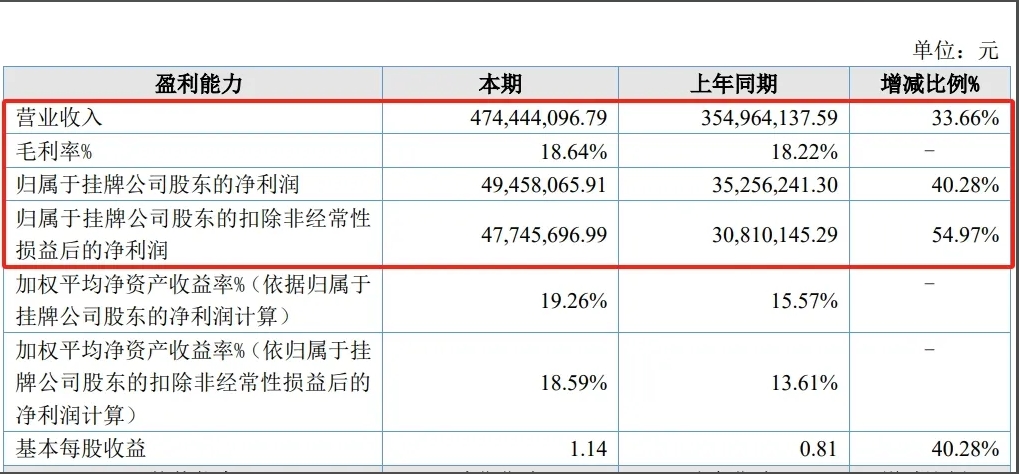年報顯示,泰達(dá)新材2023年實現(xiàn)營業(yè)收入4.74億元,同比上升33.66%;營業(yè)成本3.86億元,同比增長32.97%;利潤總額5061.34萬元,同比增長38.32%;歸屬于母公司所有者的凈利潤4945.81萬元,同比增長40.28%。