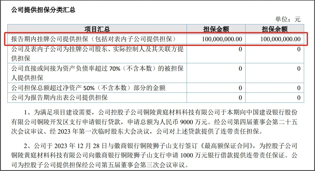 泰達(dá)新材于2023年12月28日與徽商銀行銅陵獅子山支行簽訂《最高額保證合同》,為控股子公司銅陵公司向徽商銀行銅陵獅子山支行申請1000萬元銀行借款提供連帶責(zé)任保證,擔(dān)保期間為2024年1月1日至2025年1月1日。公司為控股子公司提供擔(dān)保經(jīng)公司第五屆董事會第三次會議審議。
