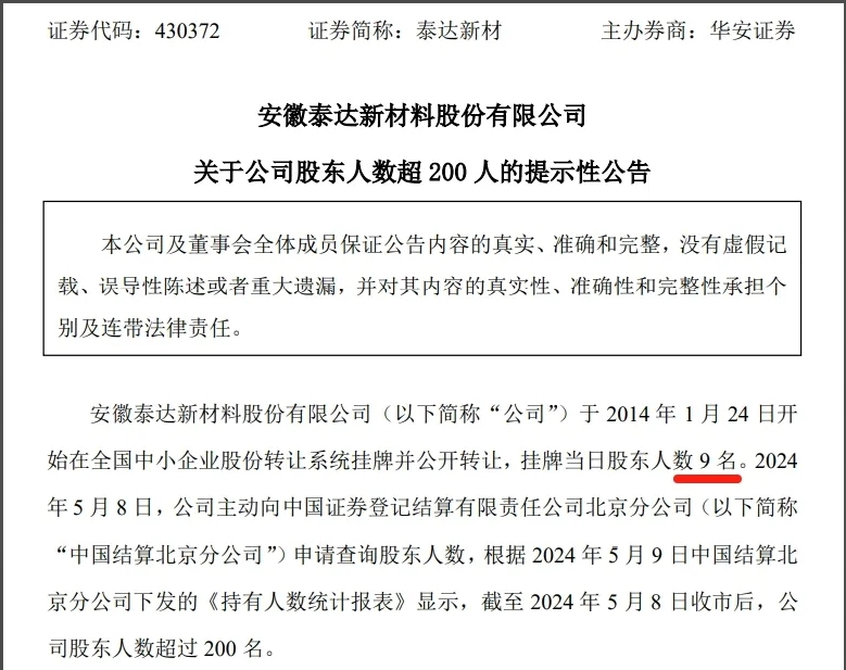 此外,泰達(dá)新材股東也大幅增加。同日,泰達(dá)新材對外發(fā)布《關(guān)于公司股東人數(shù)超200人的提示性公告》。公告中指出,泰達(dá)新材于2014年1月24日開始在全國中小企業(yè)股份轉(zhuǎn)讓系統(tǒng)掛牌并公開轉(zhuǎn)讓,掛牌當(dāng)日股東人數(shù)9名。不過,截至2024年5月8日收市后,公司股東人數(shù)超過200名。