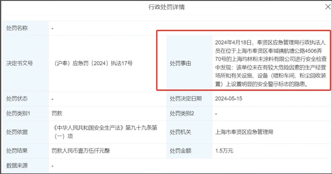 近日,上海均林粉末涂料有限公司因未在有較大危險因素的生產(chǎn)經(jīng)營場所和有關(guān)設(shè)施、設(shè)備上設(shè)置明顯的安全警示標(biāo)志,被上海市奉賢區(qū)應(yīng)急管理局處以罰款人民幣1.5萬元。這一事件的曝光,讓安全生產(chǎn)的重要性再次凸顯在公眾視野。