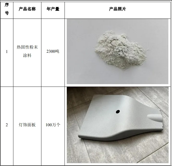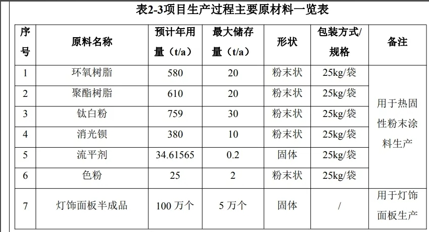 根據(jù)披露,環(huán)氧樹(shù)脂預(yù)計(jì)年用量580t/a、聚酯樹(shù)脂預(yù)計(jì)年用量610t/a、鈦白粉預(yù)計(jì)年用量759t/a、消光鋇預(yù)計(jì)年用量380t/a、流平劑預(yù)計(jì)年用量34.61565t/a、色粉預(yù)計(jì)年用量25t/a、燈飾面板半成品預(yù)計(jì)年用量100萬(wàn)個(gè)。