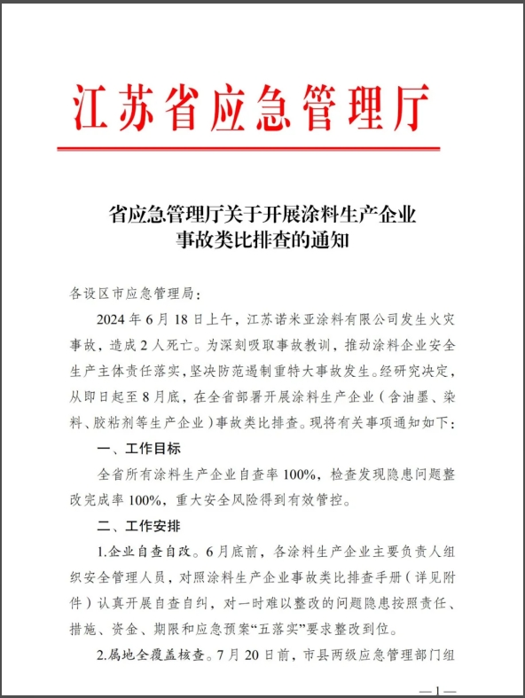 事故發(fā)生后,江蘇省應(yīng)急管理廳對(duì)外發(fā)布《省應(yīng)急管理廳關(guān)于開展涂料生產(chǎn)企業(yè)事故類比排查的通知》。通知指出,為深刻吸取事故教訓(xùn),推動(dòng)涂料企業(yè)安全生產(chǎn)主體責(zé)任落實(shí),堅(jiān)決防范遏制重特大事故發(fā)生。經(jīng)研究決定從即日起至8月底,在全省部署開展涂料生產(chǎn)企業(yè)(含油墨、染料、膠粘劑等生產(chǎn)企業(yè))事故類比排查。